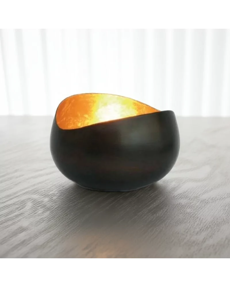 Teelicht & Goldlicht "Swing" - das perfekte Geschenk für jeden Anlass. Die in feinster Handarbeit gefertigte Teelichtschale aus Metall zaubert eine warme und stimmungsvolle Atmosphäre in Ihr Zuhause. Durch die von Hand aufgebrachte Goldfolie im Inneren reflektiert die Kerzenflamme in einem faszinierend goldenem Licht. Jedes Stück ein Unikat.