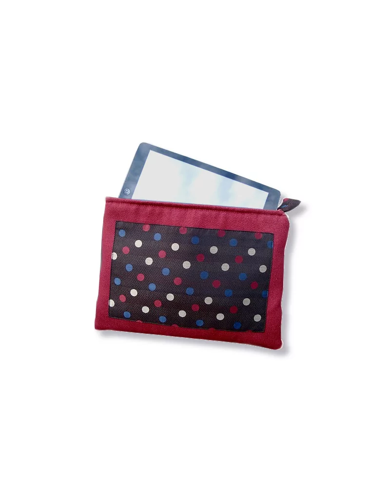 Liebevolle Kombinationen aus neuen, hochwertigen Geweben und weiteren schönen Details in Verbindung mit Stoffresten, bereiten durch die kräftigen oder dezenten Farben und Muster Freude. Dieser Tablet Bag Grösse 2 aus Stoff - Krawatte Seiden Tupfen - untersrteicht die Individualität der Besitzerin oder des Besitzers.