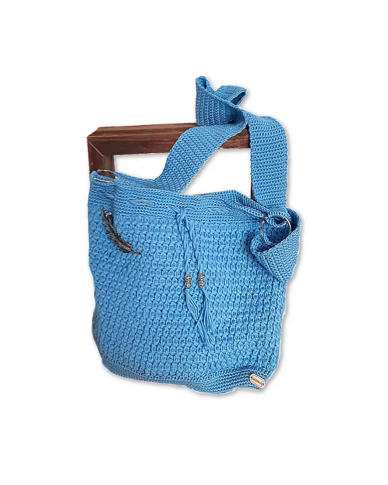 Gehäckelte Schulter- & Umhänge-Tasche, welche mit einem kleinen, abnehmbaren Metallelement verziert ist. Verschlossen wird die Handtasche mit einer gedrehten Kordel. Diese Kreationen häckelt unsere Herstellerin in Ihrer Freizeit. Häckeln ist ihre grosse Leidenschaft und es bereit Ihr grosse Freude Schönes entstehen zu lassen.