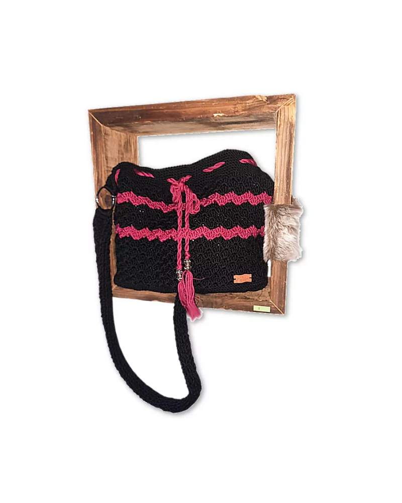 Von Hand gehäckelte Tasche aus schwarz-pink gestreifter Baumwolle.