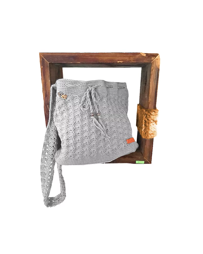 Von Hand gehäckelte Tasche aus grauer Baumwolle.