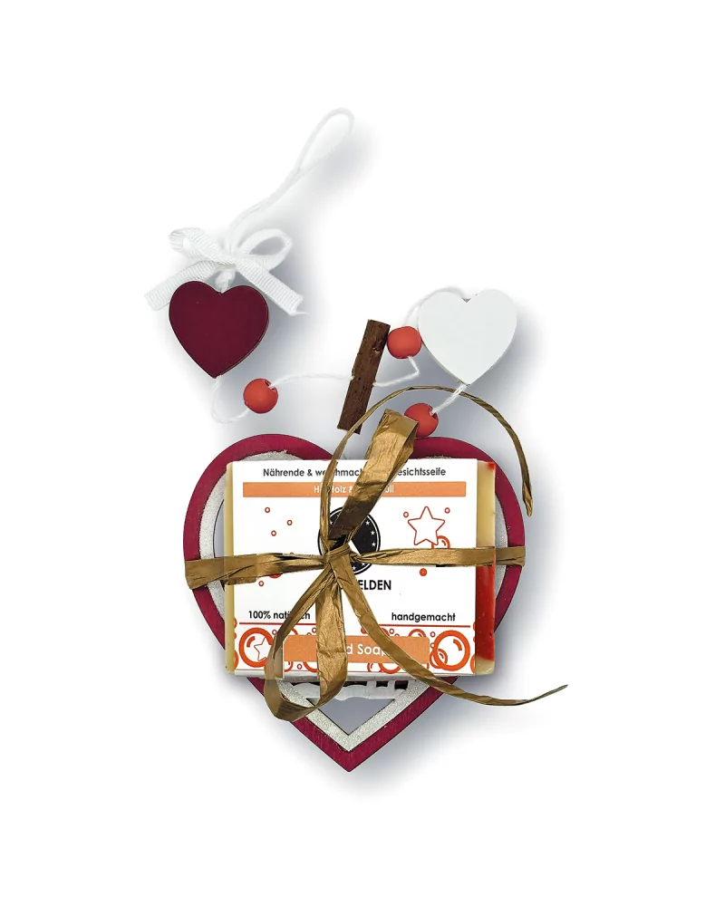 Weihnachts-Geschenkset bestehend aus einer Gesichtsseife mit Ho-Holz & Patschuli und einem Weihnachts-Baumschmuck in Herz-Form. Eine Naturseife aus den französischen Alpen!